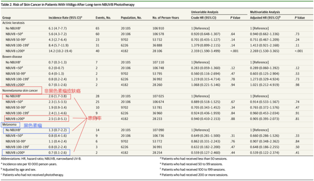 [1] Bae JM, Ju HJ, Lee RW, et al. Evaluation for Skin Cancer and Precancer in Patients With Vitiligo Treated With Long-term Narrowband UV-B Phototherapy. JAMA Dermatol. 2020;156(5):529–537.