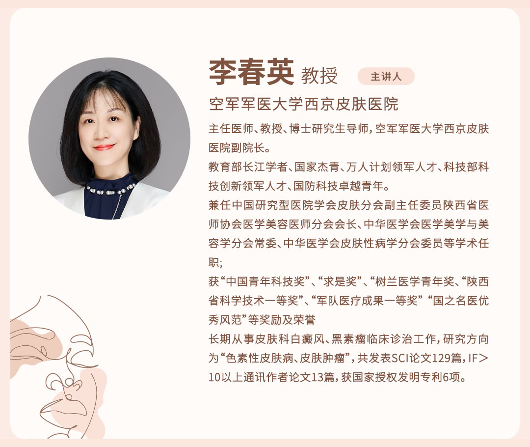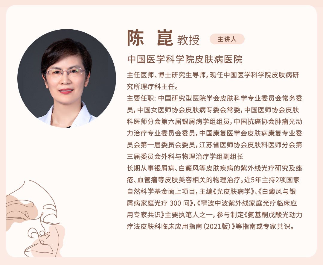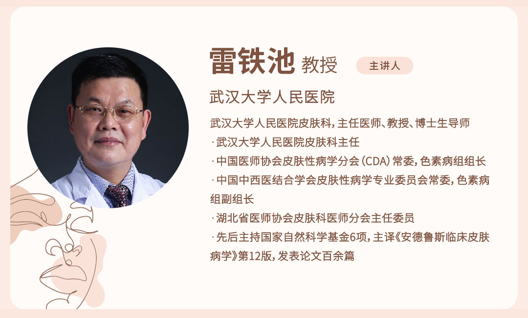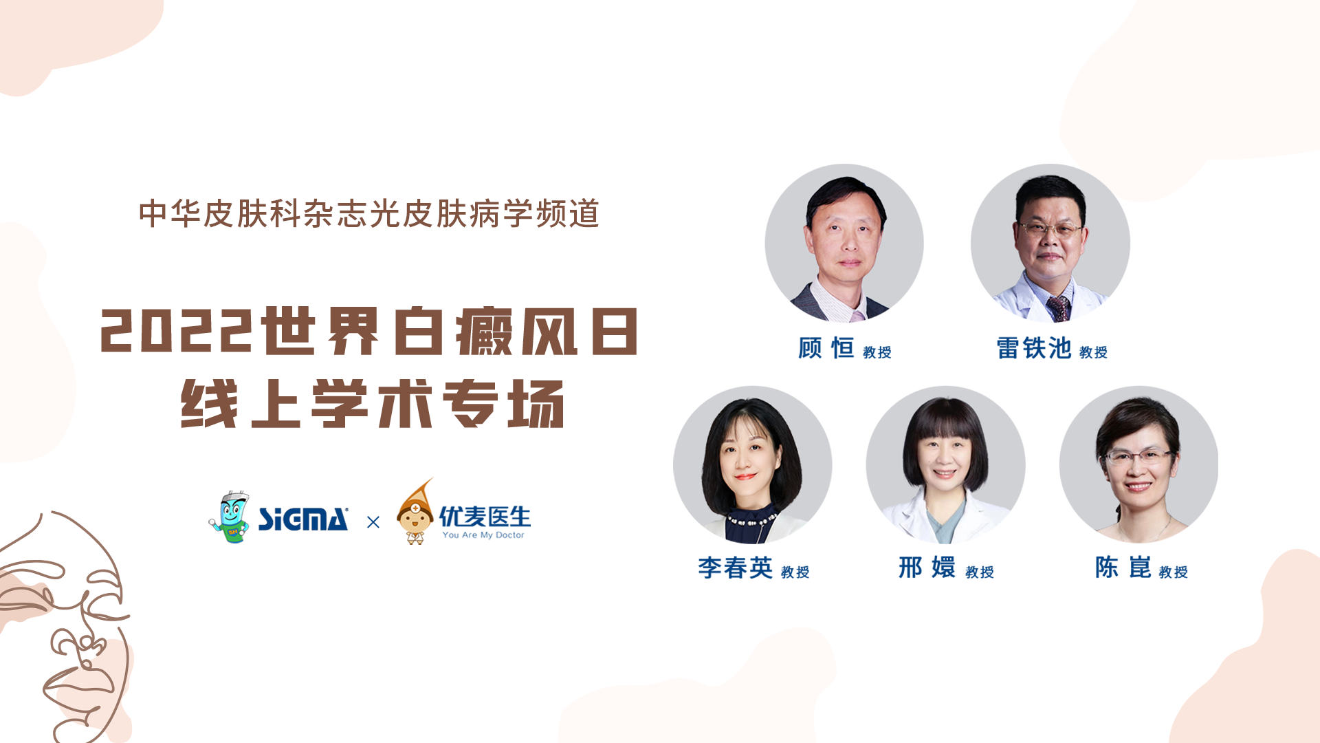 2022年6月23日晚19:00-21:00,在2022年世界白癜风日到来之际,《中华皮肤科杂志》光皮肤病学频道特邀中国医学科学院皮肤病医院顾恒教授为主持人,由武汉大学人民医院雷铁池教授、空军军医大学西京皮肤医院李春英教授、首都医科大学附属北京儿童医院邢嬛教授、中国医学科学院皮肤病医院陈崑教授为主讲人,举办了一场精彩的"2022世界白癜风日线上学术专场"。四位教授分别以《白癜风复色与紫外线光疗的反应性》、《2022 AAD:What's New in Vitiligo》、《儿童局限性白斑的诊断与鉴别》、《308nm LED在白癜风中的临床应用》为题进行了学术分享。