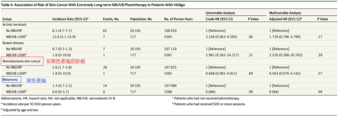 [1] Bae JM, Ju HJ, Lee RW, et al. Evaluation for Skin Cancer and Precancer in Patients With Vitiligo Treated With Long-term Narrowband UV-B Phototherapy. JAMA Dermatol. 2020;156(5):529–537.