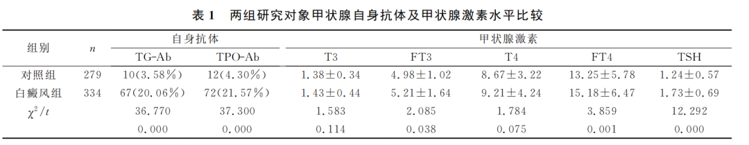 自身免疫性甲状腺病通常会导致甲状腺抗体和激素分泌异常,其中最主要的异常是甲状腺过氧化物酶抗体(TPO-Ab)、甲状腺球蛋白抗体(TG-Ab)以及促甲状腺素和血清甲状腺素的升高。而白癜风的发生、发展与这些抗体和激素息息相关。